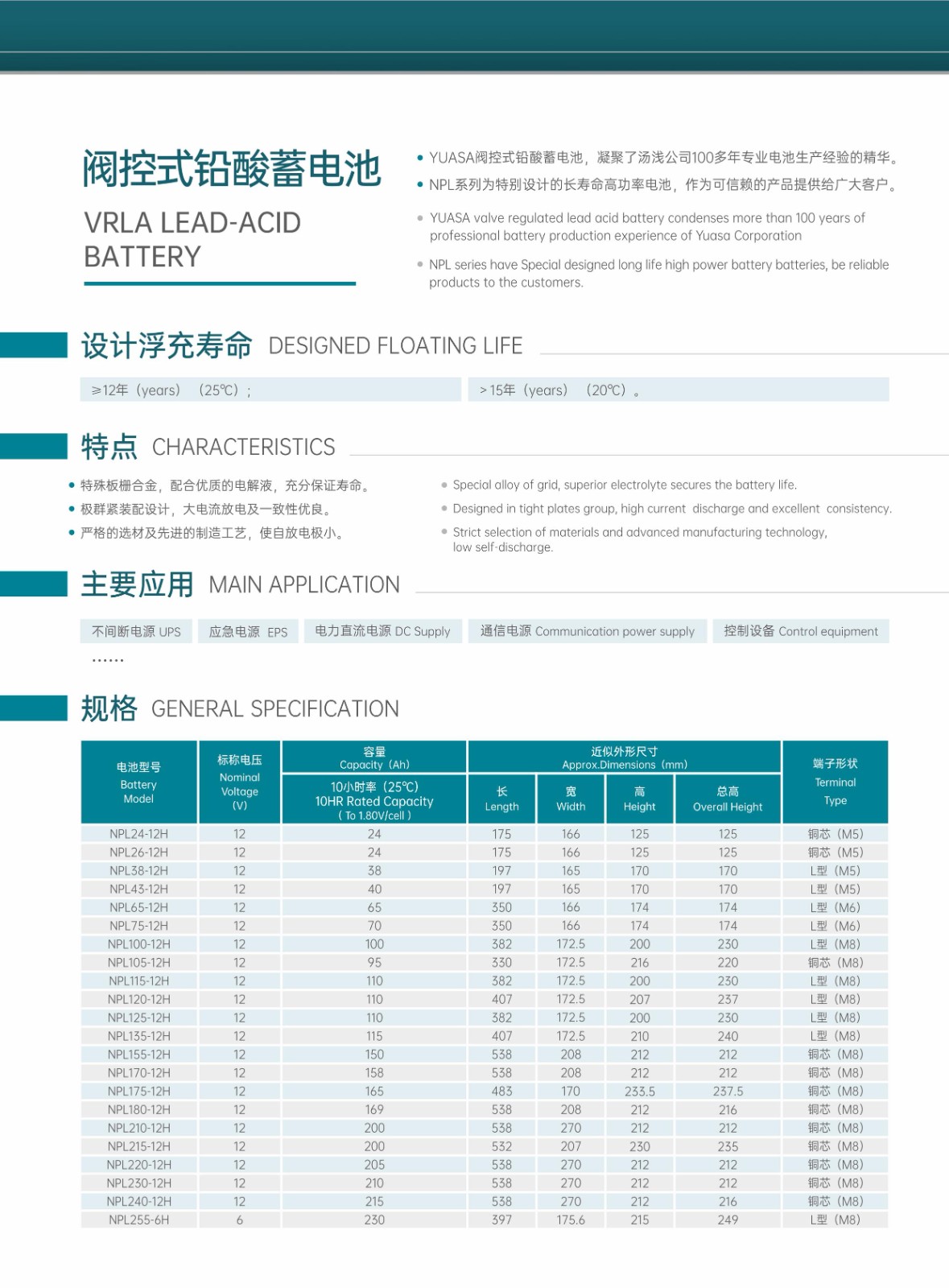 YUASA阀控式铅酸电池,凝聚了汤浅公司100多年专业电池生产经验的精华。